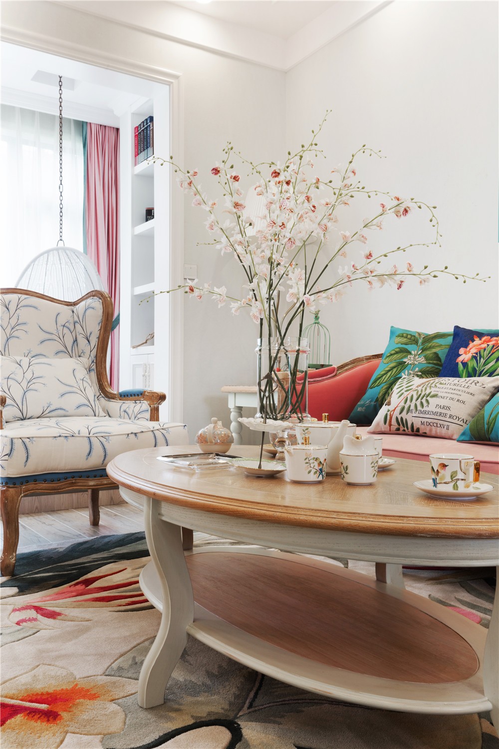 室內(nèi)客廳裝修效果圖,整個客廳選擇了簡歐簡潔,選線條圓潤,色彩豐富,用了自然綠和深藍來緩沖粉色沙發(fā)的跳躍感。