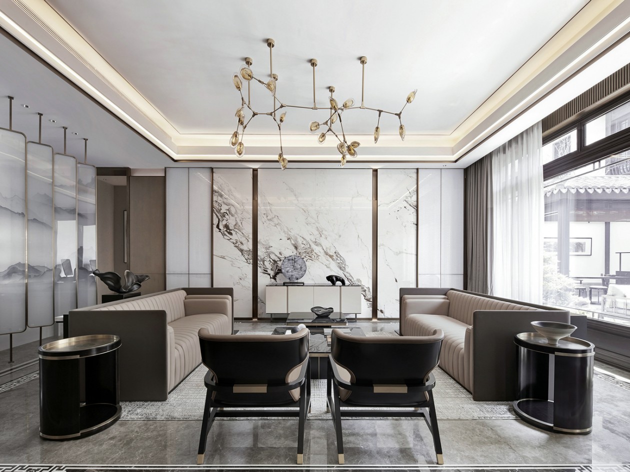 家裝設計客廳裝修效果圖,新中式風格室內家裝設計,為這種期許覓得一方歸屬,在和風細語的江南為疲累的靈魂尋得一處依附。詩語翛然,在空間中描畫山湖云影,清雅而恬靜。