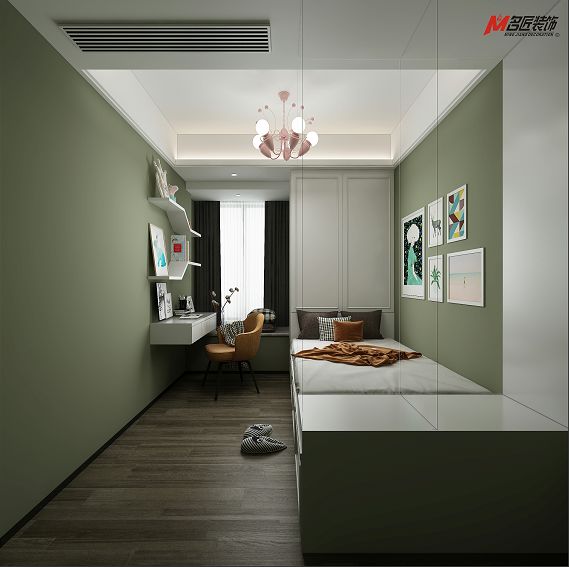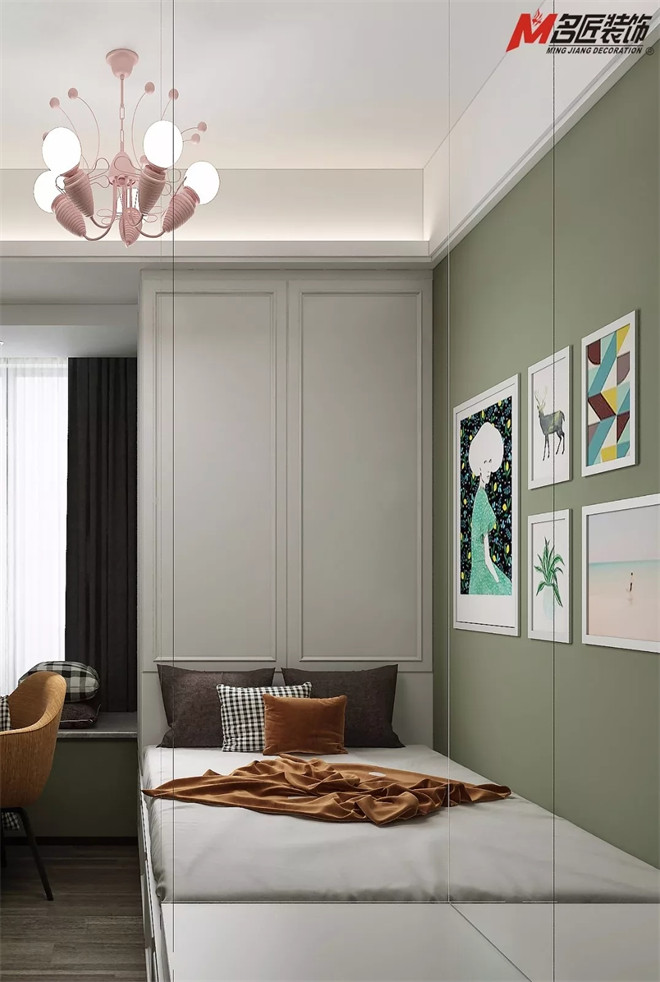 鶯色綠兒童房墻面,用上柔調(diào)的粉色燈具,以組合形式的裝飾畫為空間的視覺中心,色彩簡單明快。簡約線條造型書架,既可以裝飾也可歸置物件,不同飽和度不同明度的顏色與花紋相互交叉融合,活潑而不繁雜。