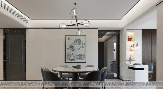 舒適圈的生活不能待太久,要走出來。設(shè)計更加如此,適當(dāng)?shù)臎_突有其存在意義。不破不立是沖突更是再平衡,這也是設(shè)計存在的意義。平衡之術(shù)運用在每一個場景里,如同客廳里那一塊藝術(shù)背景墻,與茶幾上的盆栽遙遙相望,平衡左右。切割撕裂后又將其揉合平衡是趣味所在。