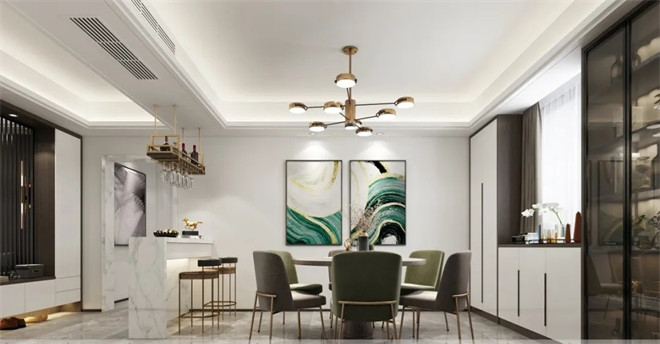 餐廳的設(shè)計(jì)延續(xù)了現(xiàn)代輕奢的風(fēng)格,整體呈現(xiàn)內(nèi)涵品質(zhì)的理想生活場景。墻體抽象畫和餐桌椅的顏色相得益彰,羅列的擺件增添了空間細(xì)節(jié)感悄悄地打動(dòng)人心。一側(cè)的餐邊儲(chǔ)物柜美觀大方且實(shí)用,一切都剛剛好,彰顯優(yōu)雅舒適。
