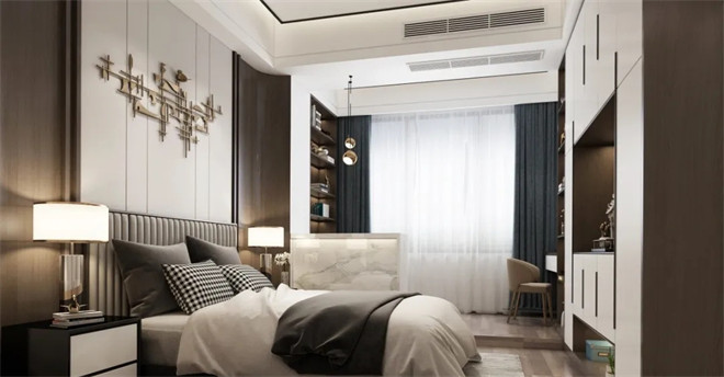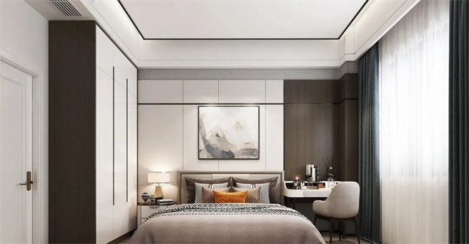 簡約的木飾面床背景,搭配灰咖色床品和同色系人字紋地毯,勾勒出和諧沉謐的美感。半面胡桃木色的墻面,與床背景、衣柜和諧且統(tǒng)一,充滿高級(jí)感。暖色系的燈光,中和了空間的冷色搭配,帶來了溫度。
