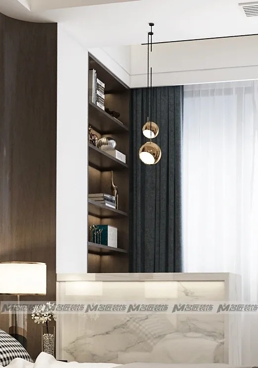 白色與胡桃木色經(jīng)典相融,當(dāng)兩者邂逅,一種沉穩(wěn)大氣的視覺效果,躍然眼前。半高的大理石墻體,規(guī)劃了書桌和臥室,僅一墻之隔,卻形成兩個(gè)獨(dú)立的生活空間。