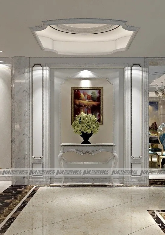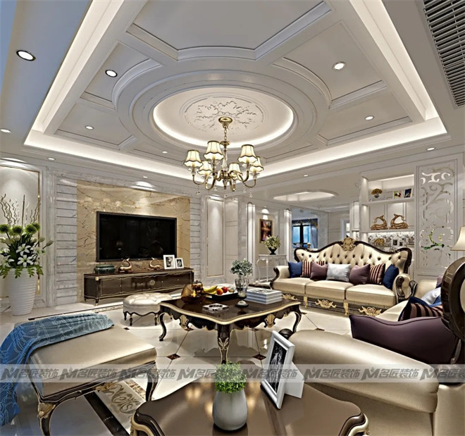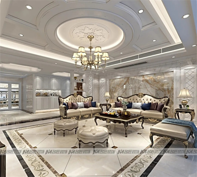 花紋對稱的金色大理石沙發(fā)墻面,線條對稱的白色窄框石膏線,以及復(fù)古的臺燈、擺飾,都展現(xiàn)出空間的規(guī)律美感,在視覺上達到平衡。造型古典的彎腿式沙發(fā),華麗的吊燈,精美的雕花鏤空隔斷,別致的拼花地磚,塑造出高貴典雅從容的居住空間。