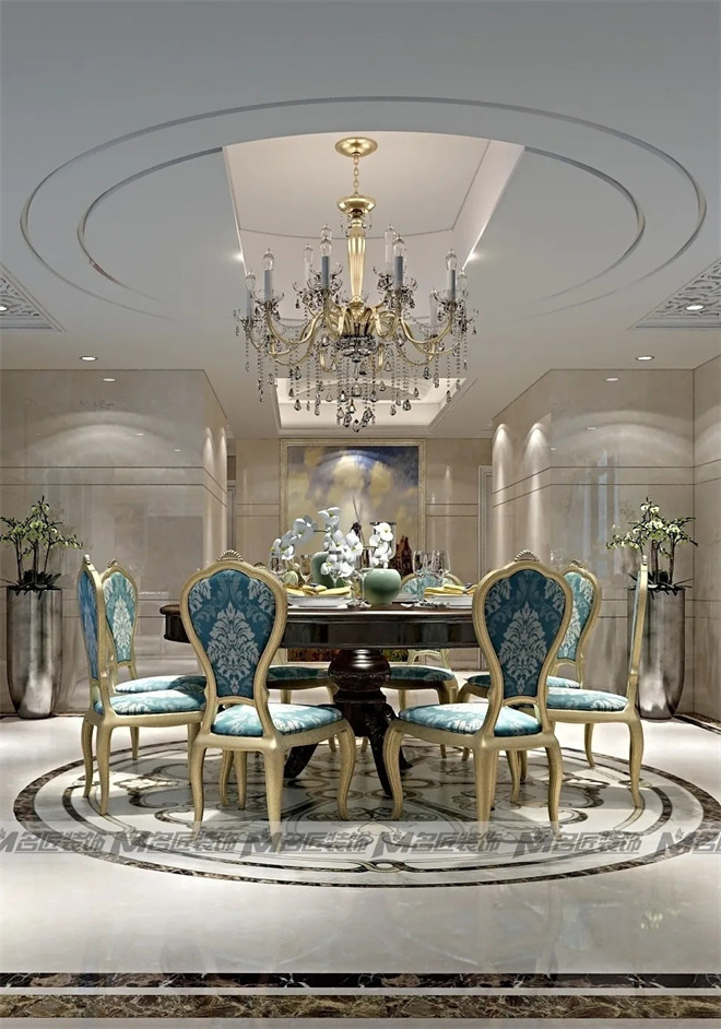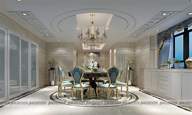 湖綠色復(fù)古花紋的餐桌椅儼然是餐廳的主角,優(yōu)雅氣派,明亮璀璨的水晶吊燈烘托出浪漫溫馨的用餐氛圍,天花板的極簡圓形線條與雕花線條相輔相成,在裝飾上盡顯華麗!