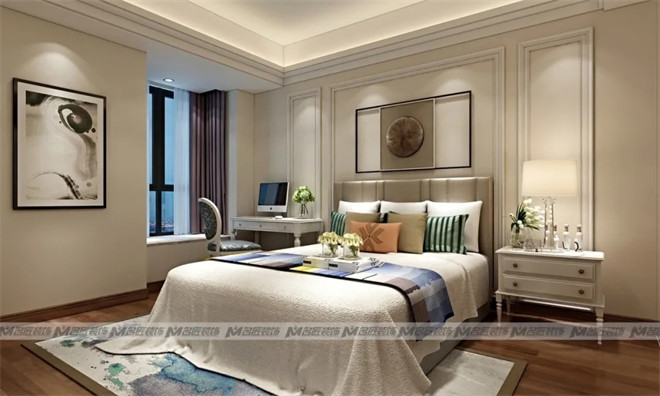 臥室整體色彩靜謐沉穩(wěn),延續(xù)米白色的主色調(diào),搭配棕色的木質(zhì)地板、藍白相間的幾何圖案地毯,象牙白色的床頭柜,黃銅金屬色的壁燈及油畫,從整體到局部,都給予人更深印象的層次感。