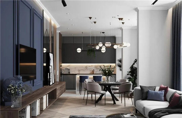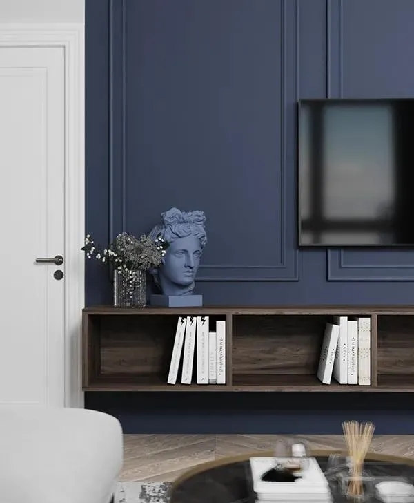 白色背景墻與電視墻藍(lán)色調(diào)相結(jié)合,形成一種清新明亮的視覺效果,搭配一些原木色家具,營造出一個(gè)簡約而有型的輕文藝之家。